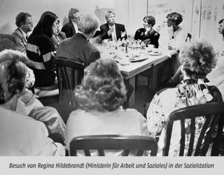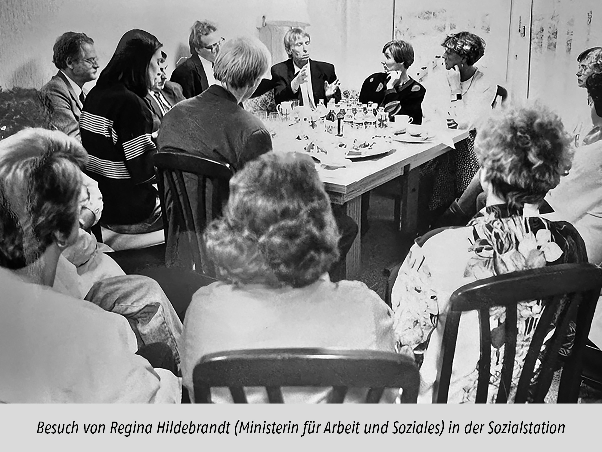 Dass ein Ortsverein Träger sozialer Einrichtungen ist, ist in der Bundesrepublik selten. Die Gründung der Sozialstation war für die AWO Strausberg folgerichtig. 1992 wurde der Trabant der Stadtverwaltung vom ersten gestifteten „Westauto“ abgelöst. Bald machte sich die Station einen Namen und wuchs auf 13 Fahrzeuge und 20 Mitarbeitende an. Ein prägendes Erlebnis war der Besuch der Sozialministerin Regine Hildebrandt, die durch ihre Bodenständigkeit, Herzlichkeit und Nähe zu den Menschen begeisterte. Ihr gemessener Blutdruck sorgte bei den Schwestern für Stirnrunzeln, sie gelobte lachend Besserung.